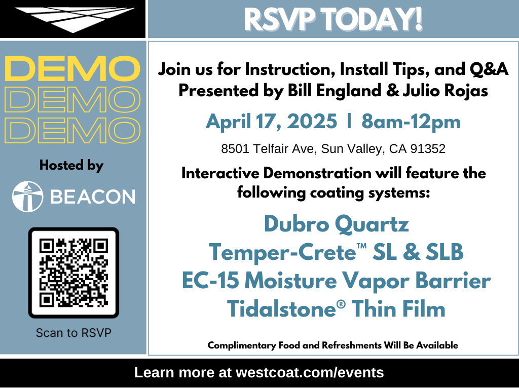 Learn cutting-edge epoxy installation techniques and elevate your projects with expert advice from industry leaders. See how Westcoat’s innovative coatings can save you time and improve durability in your next job. Enjoy complimentary refreshments while networking with top flooring professionals and learning about the latest epoxy technology!