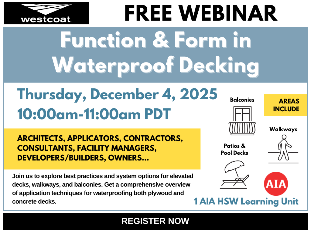 Register Here Please join us in our upcoming Webinar on December 4, 2025, from 10am-11am PT. The webinar will focus on Function and Form in Waterproof Decking. The course is open to all but is also AIA accredited and will focus on the following criteria: Learning Objectives: Identify appropriate waterproof deck coating systems for new […]