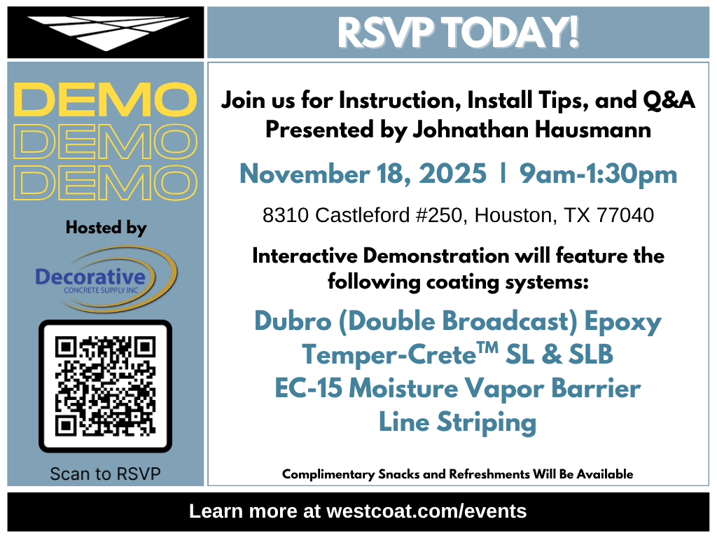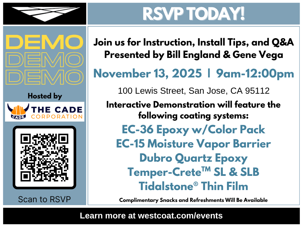 Don’t Miss Our Free Epoxy Demo Event in San Jose, CA! Learn cutting-edge epoxy installation techniques and elevate your projects with expert advice from industry leaders. See how Westcoat’s innovative coatings can save you time and improve durability in your next job. Enjoy complimentary refreshments while networking with top flooring professionals and learning about the […]