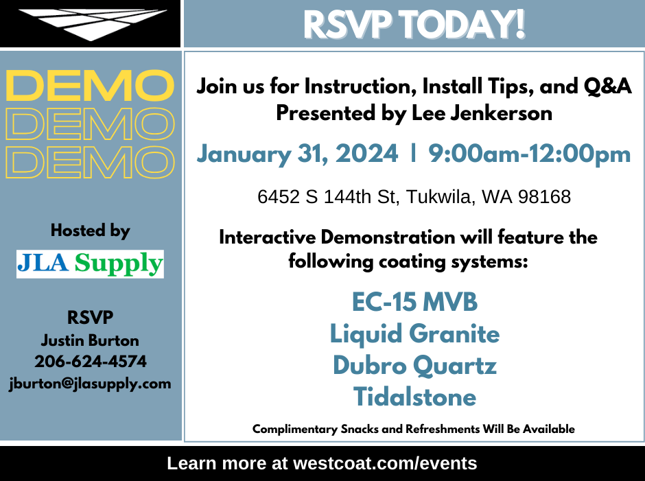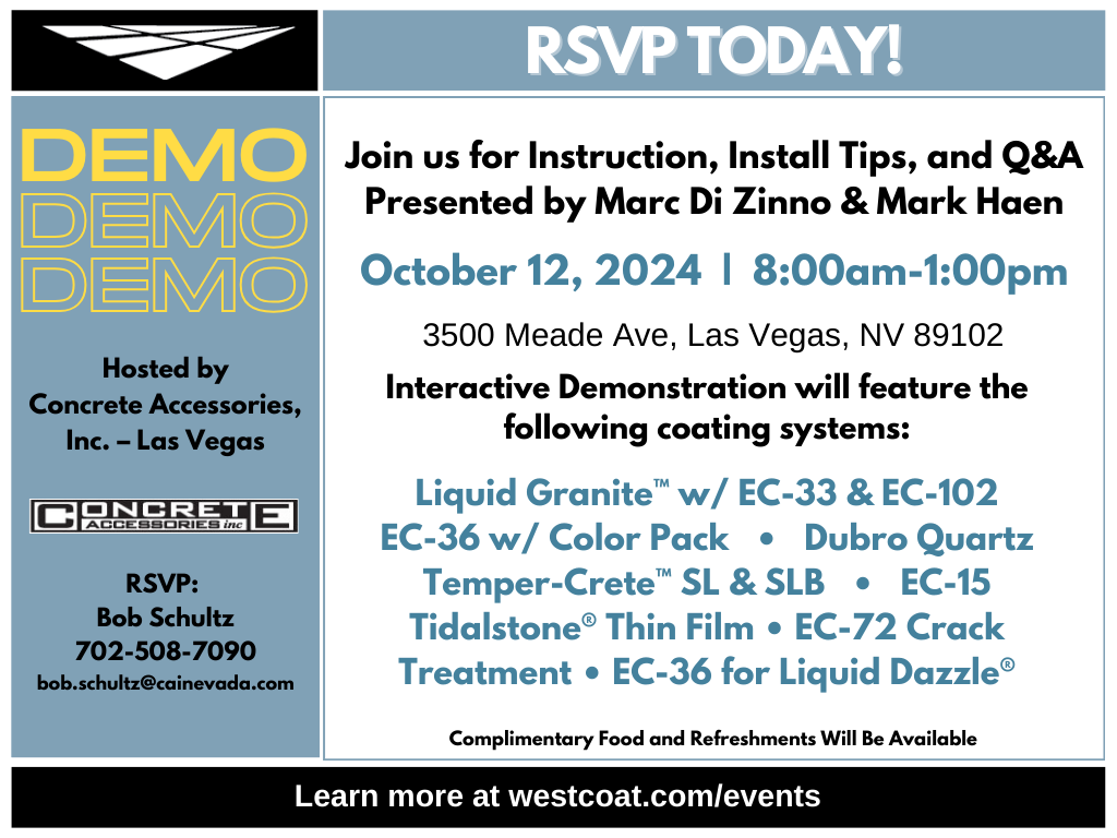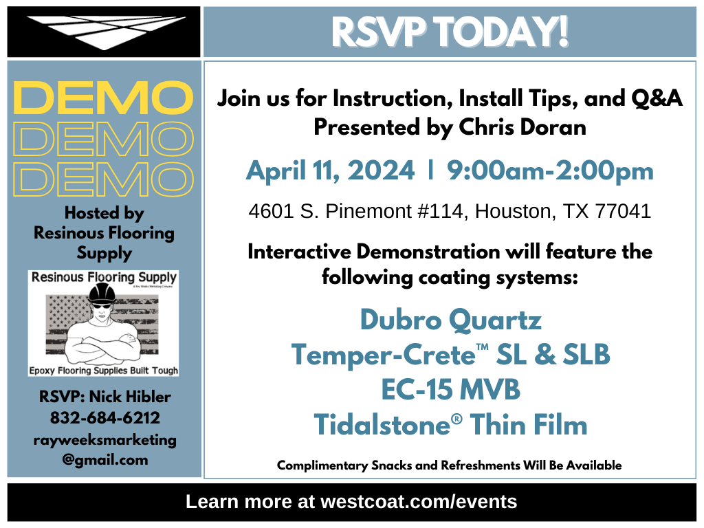 Decorative Concrete Supply, Inc. – Houston 8310 Castleford St. #250, Houston, TX, United StatesJoin us for a FREE EPOXY COAT DEMO hosted by Decorative Concrete Supply, Inc. in Houston, Texas, and presented to you by Westcoat Rep Chris Doran. April 4, 2024 9:00AM-2:00PM Watch live installation of: Dubro Quartz Temper-Crete™ SL & SLB EC-15 MVB Tidalstone® Thin Film Lunch will be provided. RSVP to [email protected].