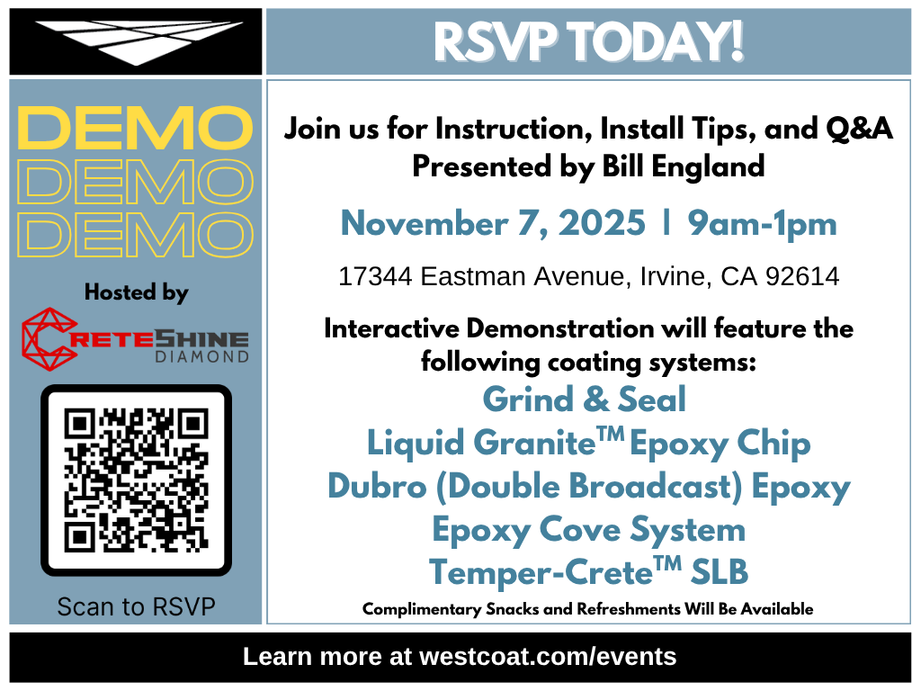 All Decorative Concrete Supply - Houston 8310 Castleford #250, HoustonDon’t Miss Our Free Epoxy Demo Event in Houston, TX! Learn cutting-edge epoxy installation techniques and elevate your projects with expert advice from industry leaders. See how Westcoat’s innovative coatings can save you time and improve durability in your next job. Enjoy complimentary refreshments while networking with top flooring professionals and learning about the latest […]