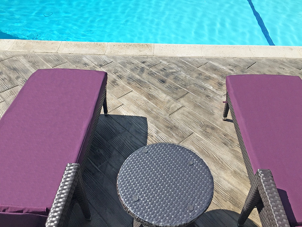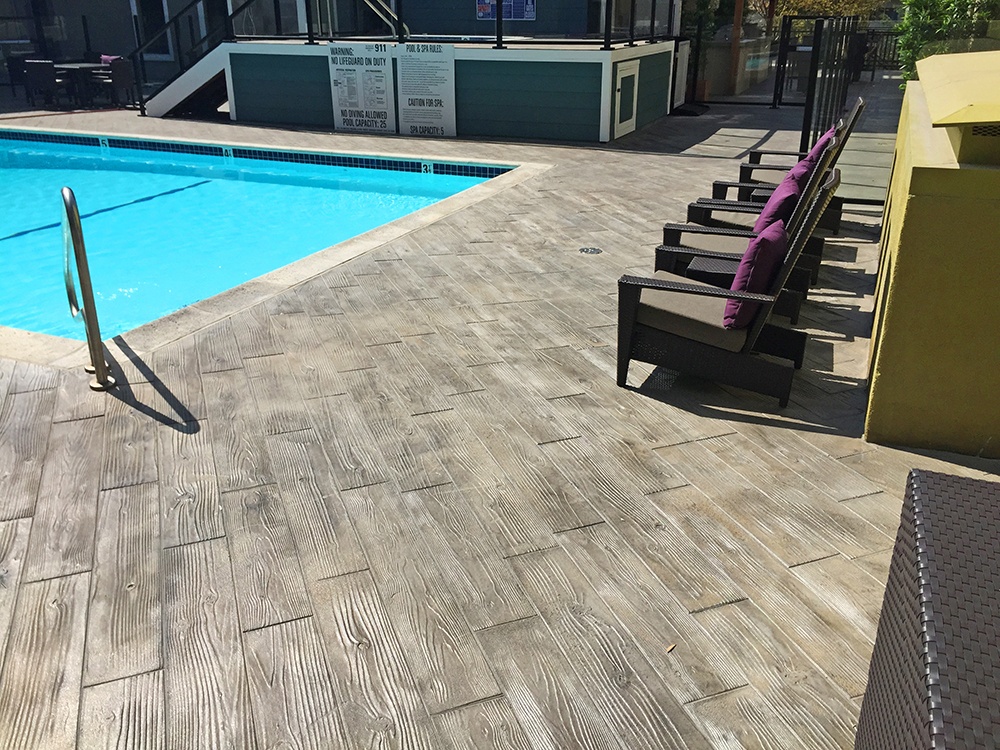 First MACoat was installed to waterproof the existing concrete around the pool. Essex Property wanted the pool deck to match the existing interior wood flooring so instead of a standard knock down texture, they installed our Stamp-It system with a wood plank finish. This technique gives the illusion of having a gorgeous wood deck but has the durablility of a decorative concrete coating. Stamp-it is highly customizable with endless stamps and textures to choose from. In this case, the wood plank stamp worked perfectly to tie in to the interior wood floor.