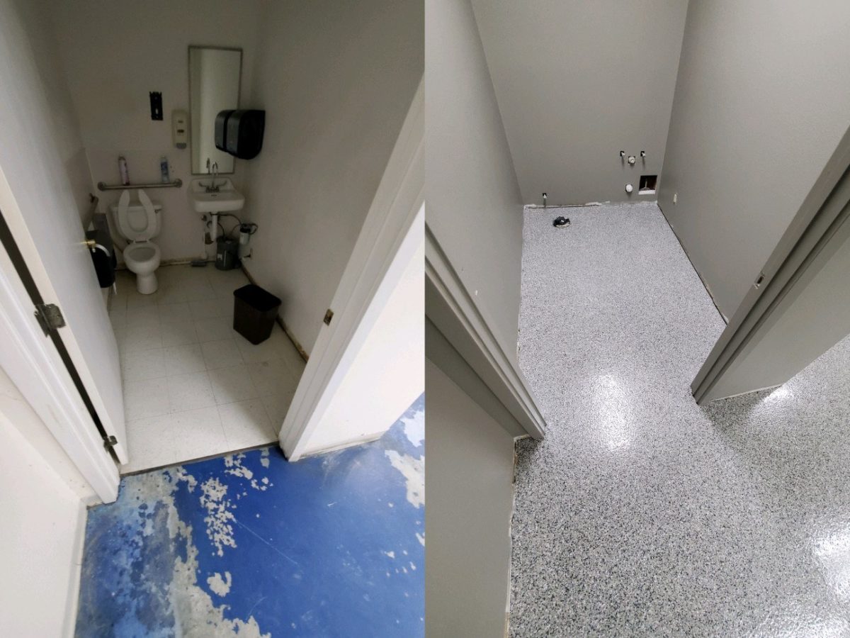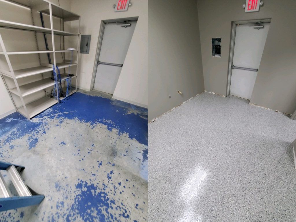 After the existing painted flooring system was prepped, all divots and cracks were repaired and Liquid Granite was installed per system specification.