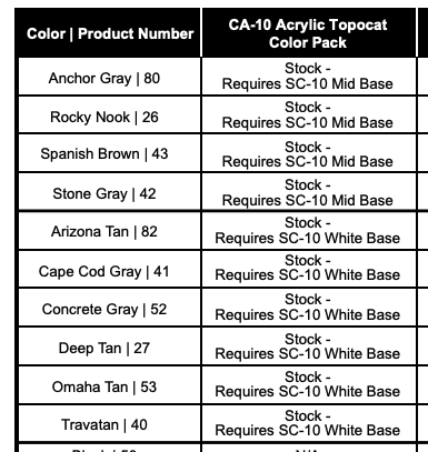 The CA-10 Color Pack system keeps the same 10 standard colors while making inventory management easier than ever. Instead of stocking multiple pre-tinted versions of SC-10 Acrylic Topcoat, distributors can now carry just the White and Mid Bases along with compact, easy-to-ship color packs.