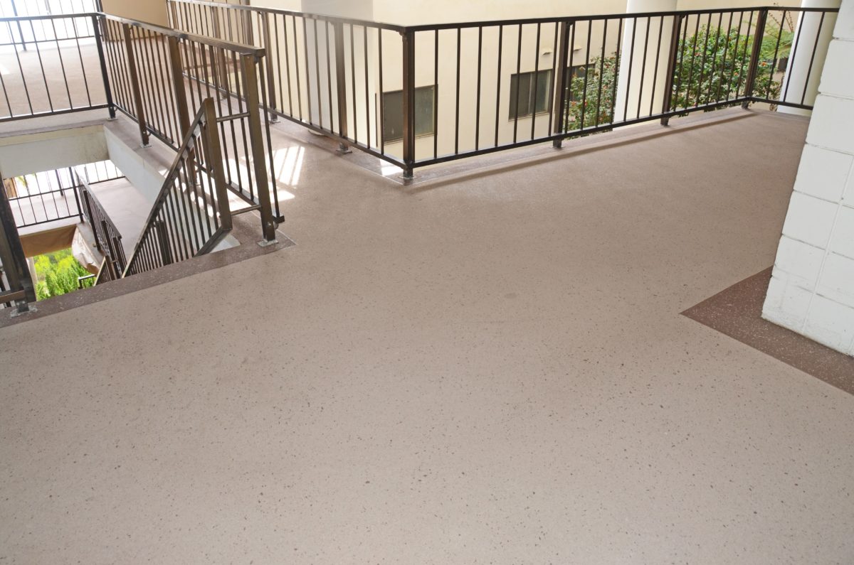 - Multiple layers of tinted TC-2 Cements were sprayed to create this orange peel texture throughout the decks and walkways.