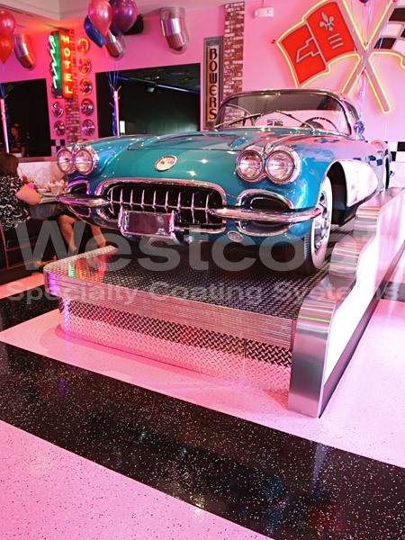 In early 2009 San Diego’s famous Corvette Diner restaurant was temporarily closed and moved from its Hill Crest location to the historic Liberty Station in Point Loma. Restaurant owner David Cohn, Owner of Cohn Restaurant Group, worked with designers and architects to reinvent his restaurant and was in the market for a durable and decorative epoxy floor to compliment the 1950’s essence of the diner.