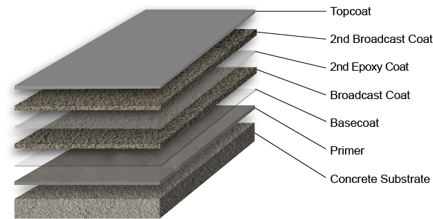 Additionally the Double Broadcast Epoxy System offers functional advantages such as high durability and scratch resistance. Dubro is designed to be used as a medium to heavy-duty coating. The end result is a seamless floor perfect for medical, sanitation or food processing facilities. This system is perfect for wet areas such as showers and pool decks or kitchens where oils and food debris are spilled onto the floor.
